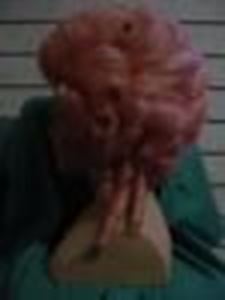 Large curls on top and back of head. Ringlets framing face and at back below large curls. Available in many colours, including pink, green, blue, etc. Whether for hire or purchase, please contact Dauphine (01179 566556) for price details.